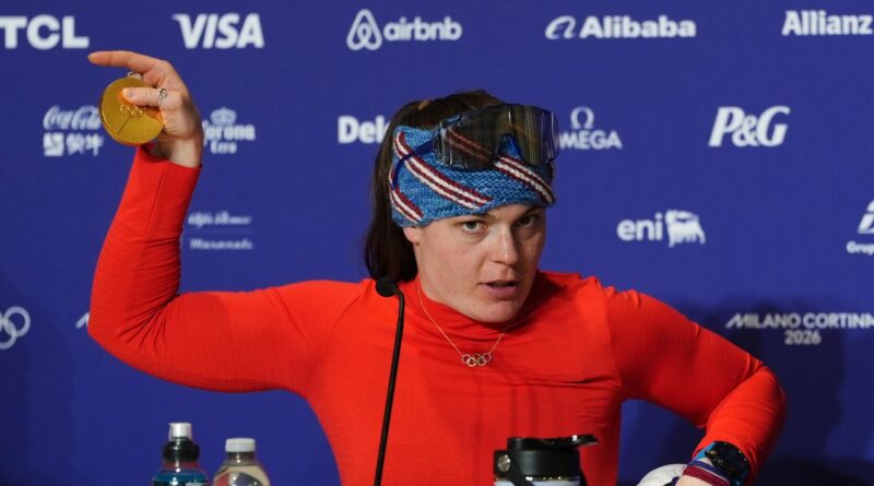 Team USA gold medal-winning skier Breezy Johnson shows her broken medal to the media in Cortina d’Ampezzo, Italy, at the Winter Olympics on Feb. 8, 2026.