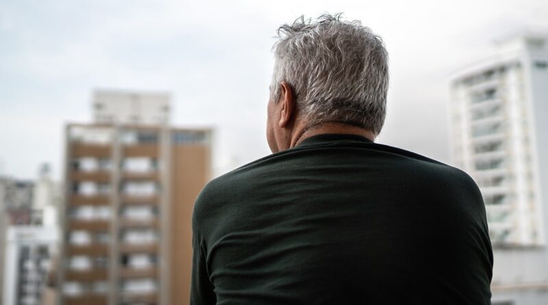senior man sitting outside overlooking city buildings
