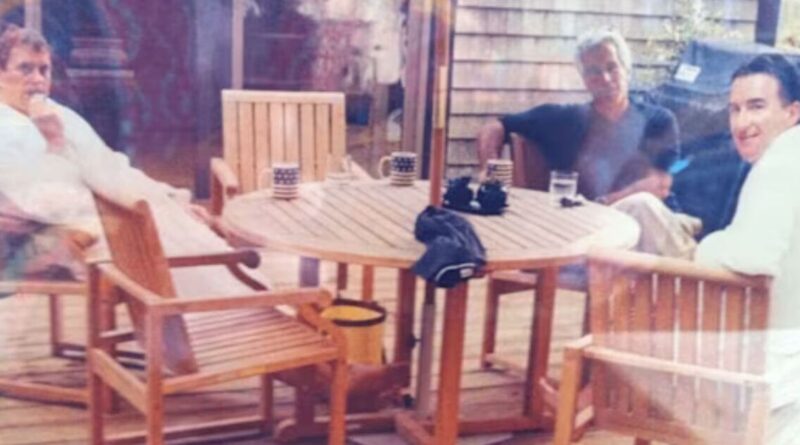 The image is reportedly the first confirmed photograph showing all three men together. Released as part of the newly published Epstein files. It depicts them sitting around a wooden table on an outdoor deck, drinking from mugs decorated with the US flag.