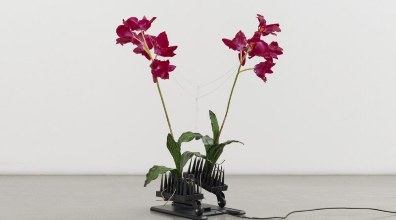 Slow Burn is made from an artificial orchid, a neck massager, bits of metal that clamp the orchids’ petals, and a monitor mount attaching the entire apparatus to a gallery wall. A motor on the massager animates metal rods that force the orchid open and close, a visual that feels caged in its sexuality, a flower forced to furl and unfurl infinitely for the viewer. Its repetitive movements allude to the way a person can become trapped in a comforting loop, endlessly rotating on a circular path of self-destruction. Youn even remarks on the way their sculptures have a lifecycle of their own, with motors burning out and mechanical hardware grinding itself into nothing inside galleries.