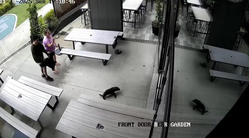 This security footage provided by Sprig + Fern The Meadows, shows a seal entering a bar in Richmond, New Zealand, on Nov. 30, 2025.