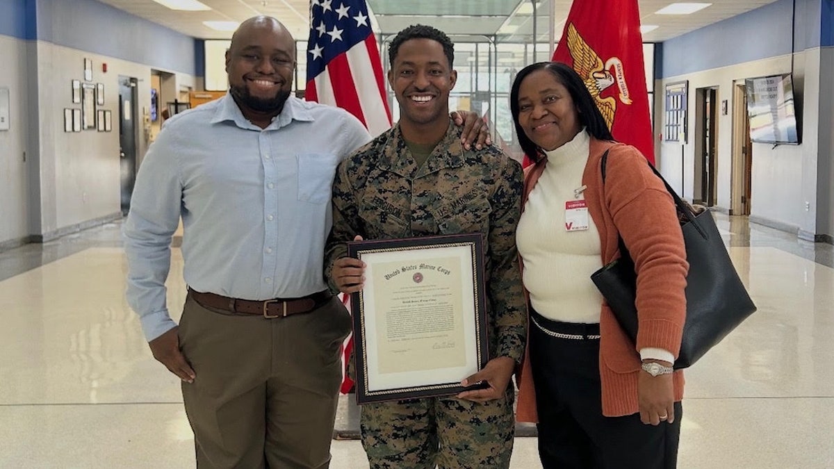 Ian Ferguson (center) is pictured with his brother, Eric Ferguson, and his mother, Cheryl Campbell-Dixon, at his promotion to staff sergeant. (Ian Ferguson)