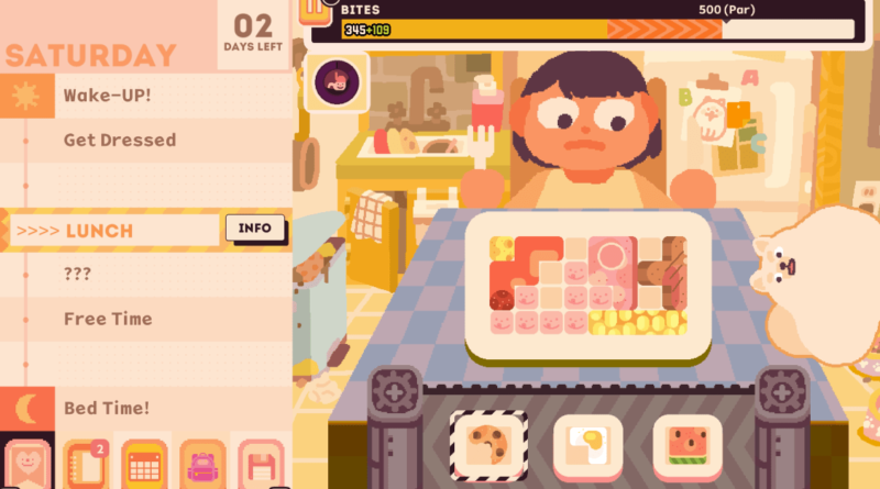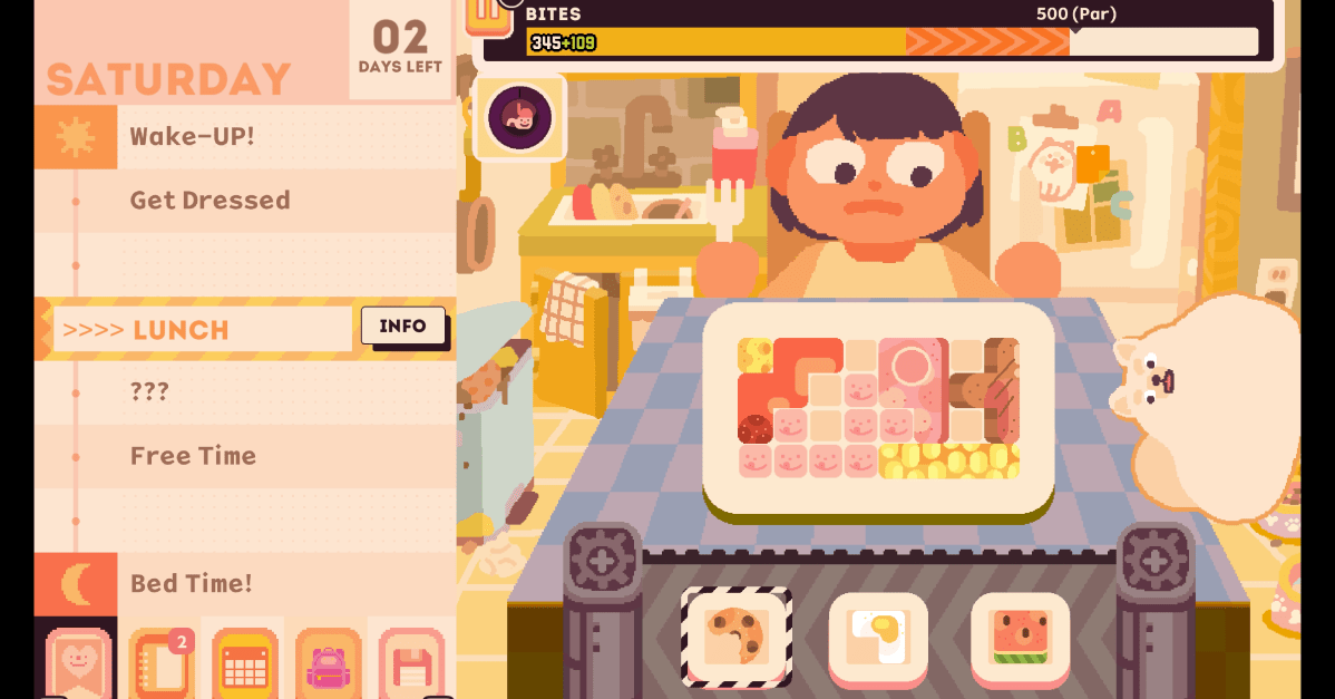 Food in Consume Me — tomatoes, kale, and pasta rendered as Tetris blocks — are assigned “bites,” a stand-in for calories. Jenny’s (the character, not the developer, who we’ll refer to using her last name, Hsia) lunch ritual is organizing these blocks on a plate, carefully selecting the pieces, and arranging them to both keep her full but stay under her self-imposed bite limit. It’s the sort of math that’s familiar in video games, but flipped upside down by the influence of controlled, disordered eating. This is no glossy-egged, open-faced croque madame from Final Fantasy XV, a dish that is as beautiful as it is powerful.