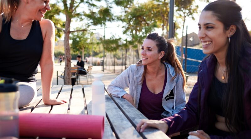 women sitting on picnic table after yoga