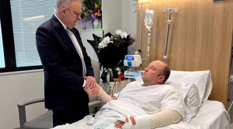 Australia’s Prime Minister Anthony Albanese visits Ahmed al Ahmed, the man who charged at one of the gunmen and seized his shotgun during the deadly attack on a Jewish event at Bondi Beach, at St George Hospital in Sydney, Australia, Dec. 16, 2025.
