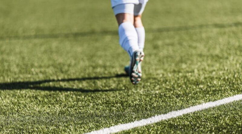 Back view of a soccer player running on a green grass pitch with white touchline. Close-up of legs in soccer cleats and white socks during a match or