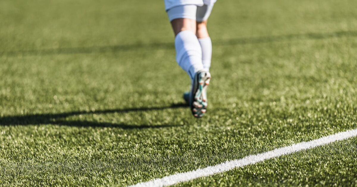 Back view of a soccer player running on a green grass pitch with white touchline. Close-up of legs in soccer cleats and white socks during a match or