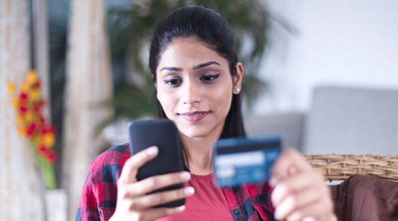 A woman checks her bank account