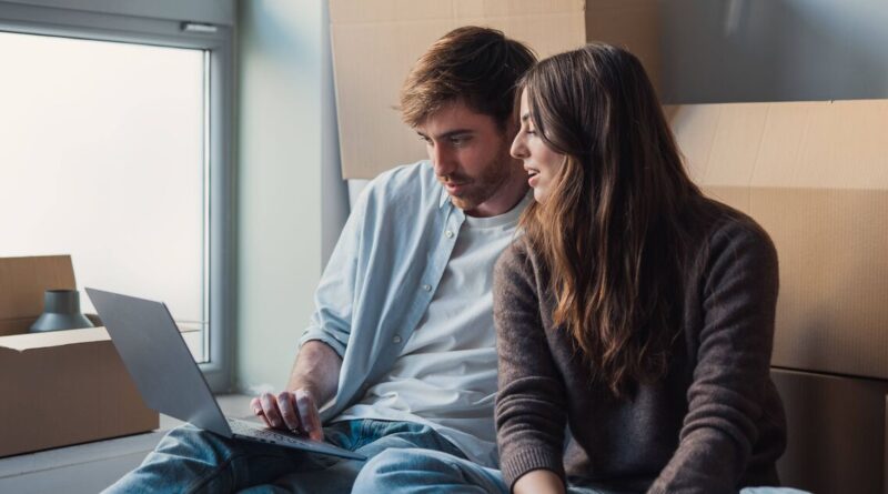 Young couple sitting on the floor surrounded by moving boxes
