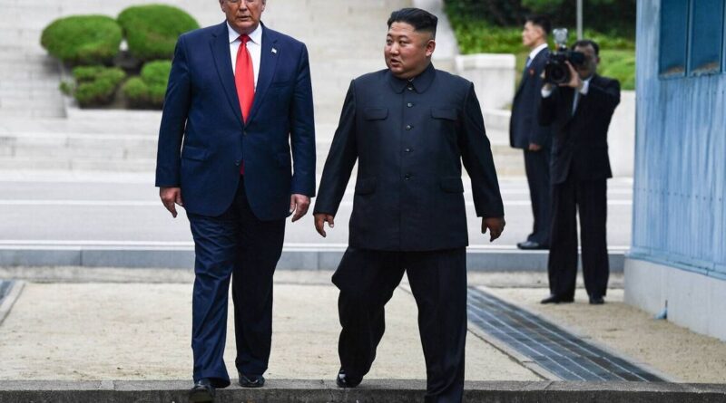 (FILES) North Korea’s leader Kim Jong Un and US President Donald Trump cross south of the Military Demarcation Line that divides North and South Korea, after Trump briefly stepped over to the northern side, in the Joint Security Area (JSA) of Panmunjom in the Demilitarized zone (DMZ) on June 30, 2019. A new push to lift aid sanctions on North Korea could kickstart efforts to lure Kim Jong Un into nuclear negotiations with US President Donald Trump, analysts told AFP. (Photo by Brendan Smialowski / AFP via Getty Images) (Image: AFP via Getty Images)