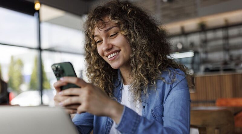 Young smiling woman using mobile phone while working on a laptop at a cafe