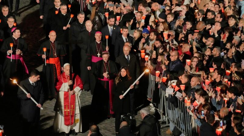 Faithful gather to watch Pope Leo XIV during the torchlit Good Friday procession in Rome.