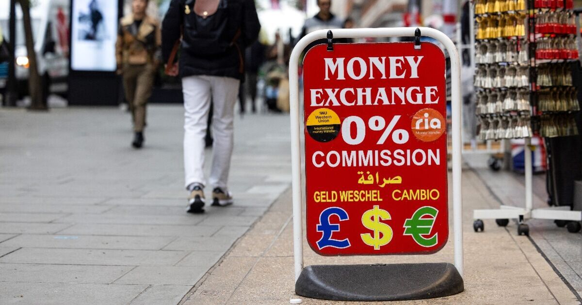 Pedestrians walk past a sign for a currency exchange service in a shop on Oxford Street, London
