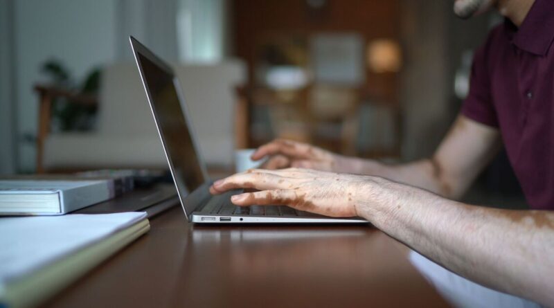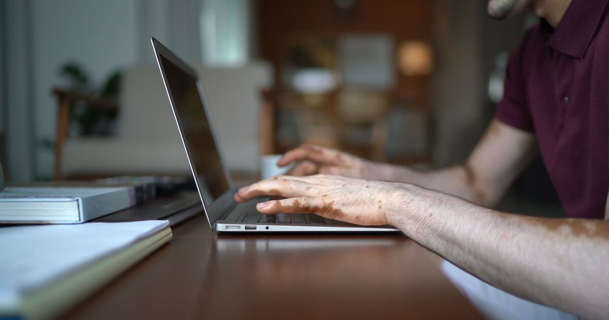 Close up in male hands with vitiligo typing in laptop at home