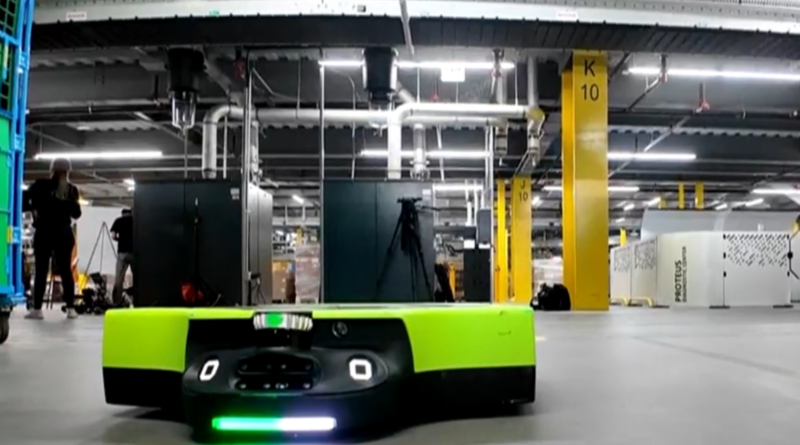 The robots have different functions to help move and lift the packages. For example, the robot Proteus hauls pallets and orders across the facility floor, while Cardinal lifts packages into pallets set for delivery.