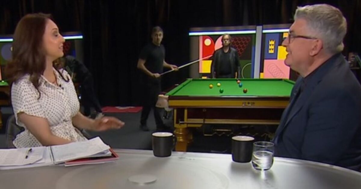 O’Sullivan was front and centre throughout the evening broadcast, with his match wrapped up earlier in the day. He enjoyed hours of practice and presenter Jaswal had to address the elephant in the room behind her.