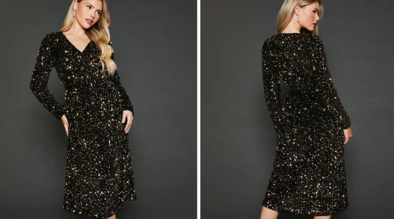 The dress is currently available in sizes 8 to 14, there are also 16 and 18 but they are both out of stock at the moment. This sequinned number is ideal for nights out or Christmas work parties as it features a tummy-flattering wrap design.