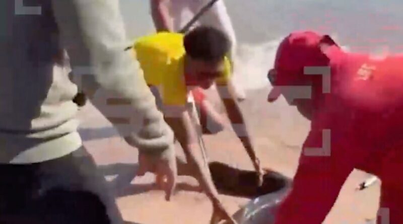 After the painful attack on the Russian tourist, footage shows how hotel workers struggled to capture the thrashing eel in a plastic bag as tourists crowded around on the shores of the beach.