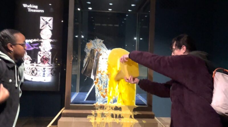 “Two Take Back Power supporters covered the glass containing the crown jewels in custard and apple crumble,” read a statement on their website, which refers to the organization as a “new nonviolent civil-resistance group.”
