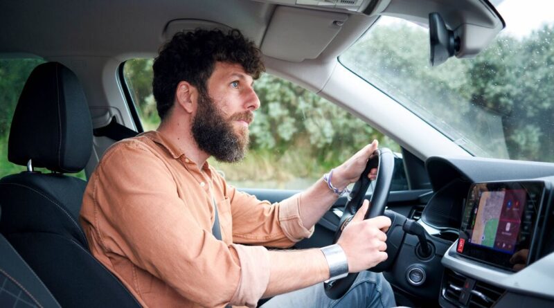 Adult man with curly hair focused on driving a car with a touch screen on the dashboard